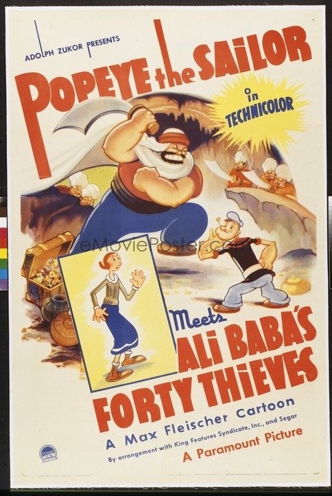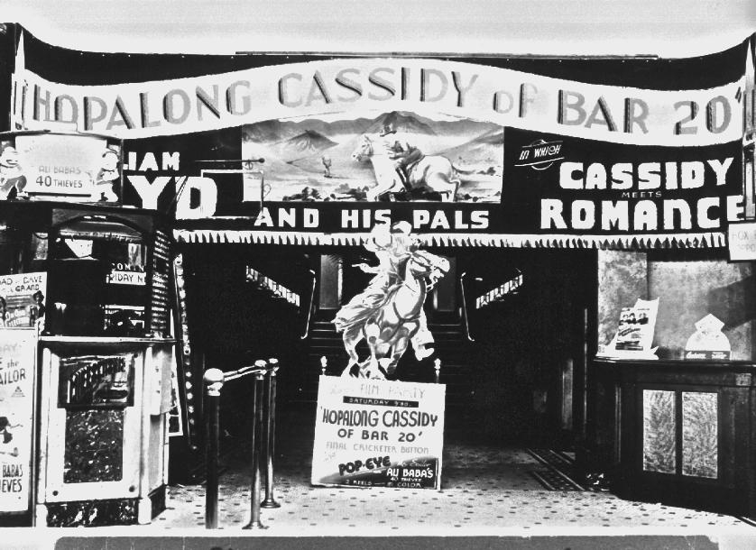 Grand Theatre Perth various Cassidy Of Bar 20 ( 1938 ) display material displayed as Hopalong Cassidy Of Bar 20. I was in two minds as whether to show this image but decided to do so after investigating on what appears to be an Australian one sheet displayed on the bottom left hand side of the image. On the supporting programme it advertises the 17 minute colour cartoon Popeye The Sailor Meets Ali Baba's Forty Thieves ( 1937 ). Above on this entry entry is an original U.S. one sheet of Popeye. Looking at this poster I believe the Popeye poster on display at the cinema would have been very similar to the U.S. version. I have never seen any original Popeye Australian film poster images so I am wondering if anyone else has ? Also of interest is the bottom centre display which shows Film Party Saturday with Final Cricketer Button appearing This promotion being obviously intended to lure the children in.
