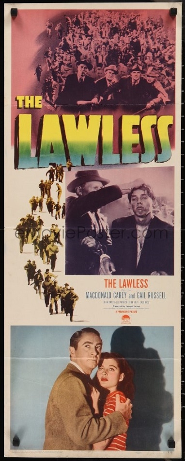 The Lawless ( 1950 ) U.S.A. insert poster, and a rare Australian daybill poster re-titled here as being The Dividing Line. Surprisingly seeing that the film is credited as being film noir, that when released in Australia it was only awarded a For General Exhibition censorship certificate,The film deals with racial discrimination and mob rule in the south of the U.S. The mistreating of the captive that appears on the U.S. poster is missing from the Australian poster, and the huge rampaging vigilantes mob reduced drastically in size as well to a mini mob.