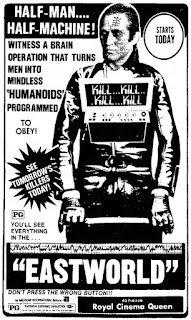 This isn't much of a poster (just a faint shot of Faye Dunaway's face)--and it was hard to photograph (This was my best attempt...sorry for the flash glare, etc.). I won tickets to the opening night of this from a local radio station. I had to have my mother go with me as I was only 13 at the time. But my mom and I loved this movie. It's more of a suspense thriller than a true horror flick.. But, yowza! Such an interesting movie (to me). From a story idea by John Carpenter (before he was anyone famous really---this came out in August 1978, before HALLOWEEN debuted).  I know it is pretty much forgotten today and even then it didn't have much of a reputation---but Mom and I both found it suspenseful and shocking. I guess I just saw it at the right time in my life for it to stick with me. The poster lives in my closet though...
