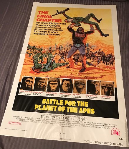 This was the second APES poster I owned (after CONQUEST OF THE PLANET OF THE APES which I'd scored as a teenager).  Notice the apparent discoloration on the lower right side? That was because the eBay seller wasn't very careful when he packed this up---and got some of the sticky glue/tape stuff on those USPS Priority Mail boxes on the poster. (No, the poster was NOT wrapped in plastic or anything else protective. Just shoved in a box, sealed, and sent. I had to painstakingly super slowly peel it away, That discoloration is a thin layer of the box still attached to the back of the poster. GRRR. I have purchased another copy or two since getting this one. But this remains my least favorite film in the series as well as my least favorite poster.