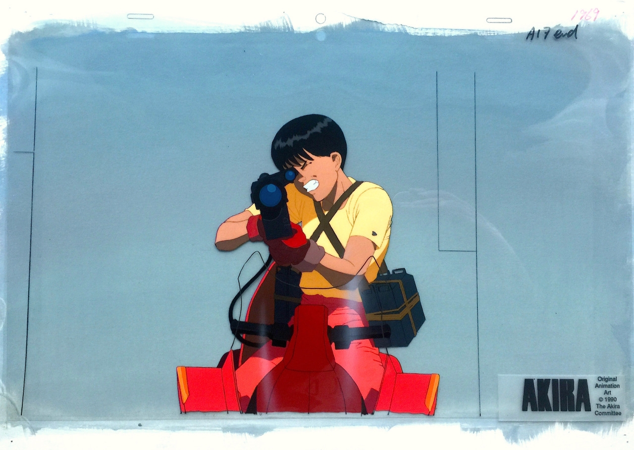 Certain frames contain many more layers than this. Some feature eight or more individual cels working together to create a full shot. Amongst collectors, these are known as key-master set-ups. They are very rare and highly sought after as a result. Mainly due to the fact that the cels in Akira ran at a rate of 24 frames per second instead of the usual 12. And backgrounds can remain on screen for up to 10 seconds at a time. The rarity of the backgrounds has been compounded by the fact that many of the backgrounds were used as packing material for the cels when they were shipped from Japan to the US in the early 90's to be used as promo items.